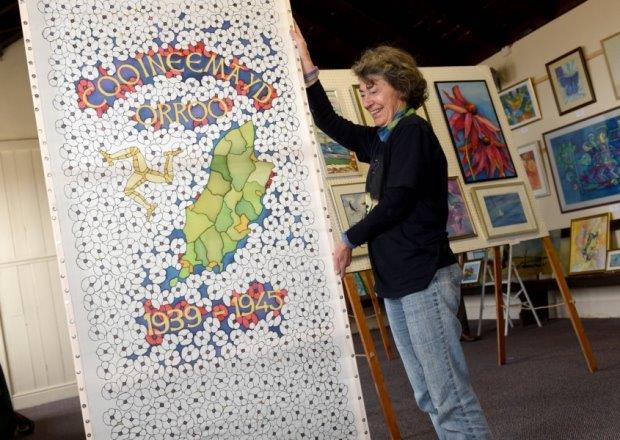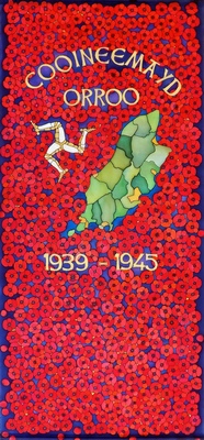 The Poppy Banner, hand painted on silk, commemorates the 501 Manx servicemen and women who gave their lives during World War 2. A project to raise funds for the Royal British Legion Isle of Man. It was designed and made by Betty Hopson, a member of The Guild of Silk Painters IOM, and painted with the help and sponsorship of members of the public. The banner will be handed over to the Chairman of the Island’s British Legion – the Hon. Steve Rodan (SHK) at the Sefton Hotel , Douglas on Remembrance Day following the Service at the Memorial. Artist Betty Hopson will be awarded a Certificate from the Legion for her work. The banner will then go on show in a glass case at The Strand Centre over the Legion’s Poppy Appeal for the public to view their painted poppies after which it will go to St Johns Church. The MANN050 Friendship Centre have sponsored cards of the banner which will continue to raise funds for the Island’s Legion.